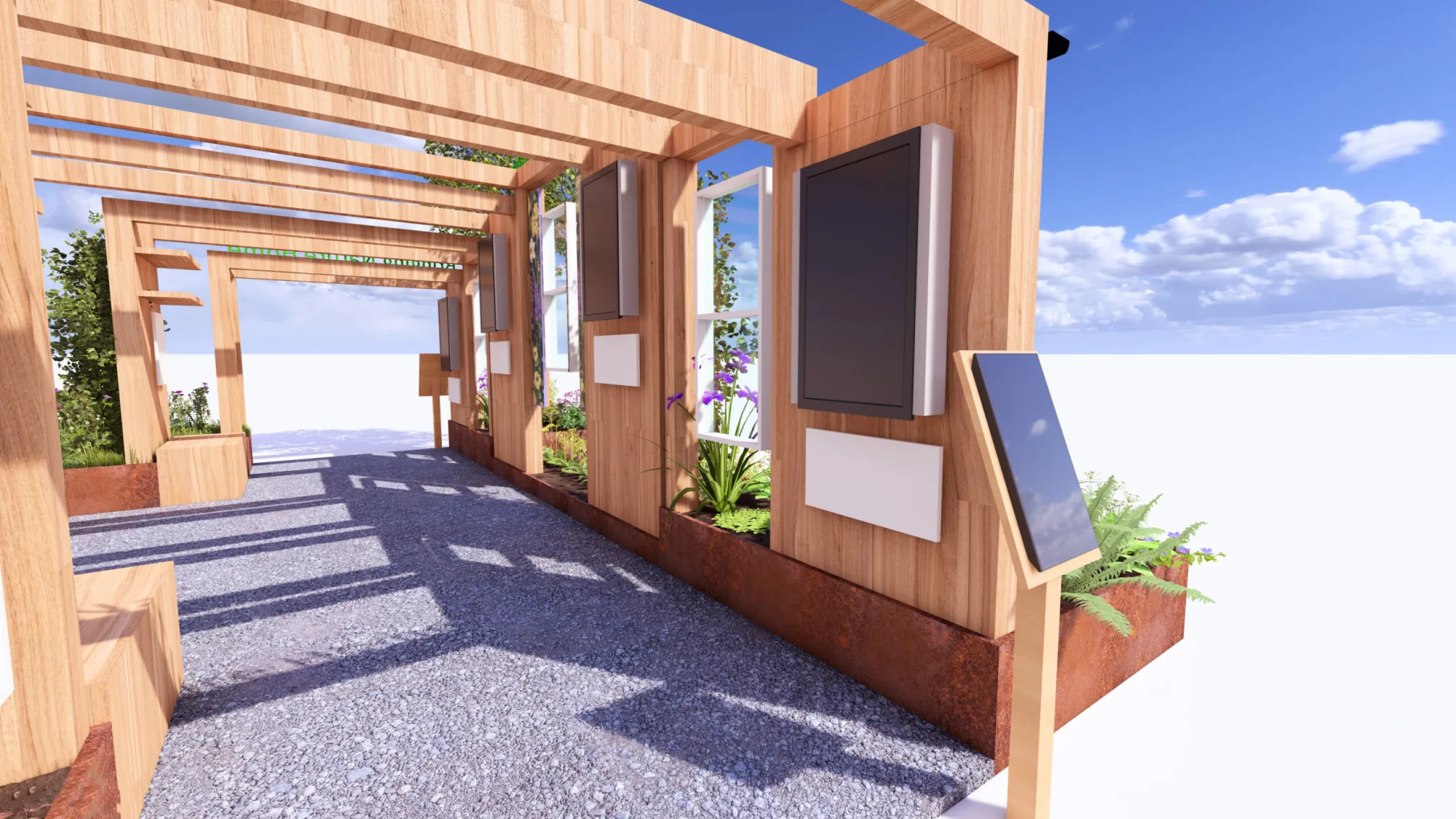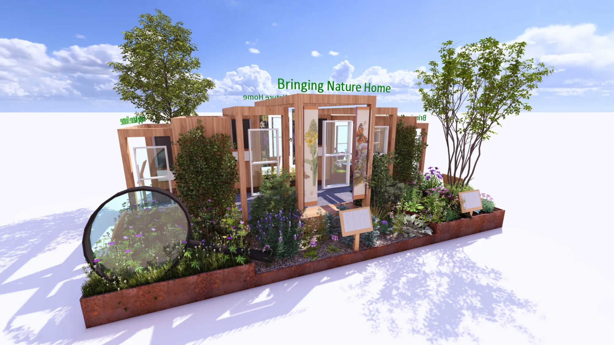 Inspired by a row of terraced houses the exhibit has a central wooden structure, with a homely hallway interior decorated with house plants, books and nature-inspired artwork. Reclaimed windows are suspended from the structure, through which the stunning planting areas are viewed. External planting areas are reminiscent of neighbouring gardens, separate but interconnected by nature.