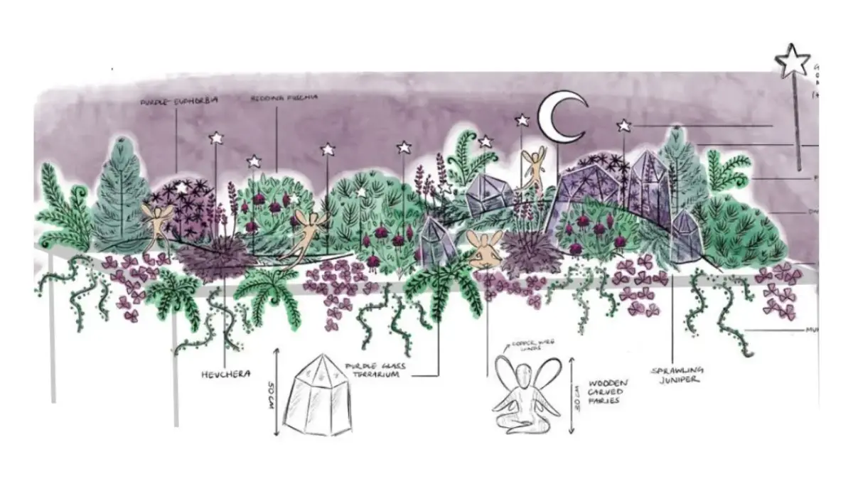 Once upon a time, I was a young child of 6 or 7 who had an infatuation with fairies! I would build them mini gardens at the bottom of my grandmother's garden. They would include sticks and stones, shiny things, pools of water, snail shells, flowers and the occasional worm! Today I am 29 and still love building gardens. I have, however replaced the snail shells and worms for shrubs and perennials. I feel this design plays on a fond memory that I often look back on when I think about how far I have come in life. I still design with escapism in mind and my favorite worlds involve fantasy realms, colours and unusual textures. Just like 6 year old me I have created this design with a mix of materials. Plants, wood, metal and glass.