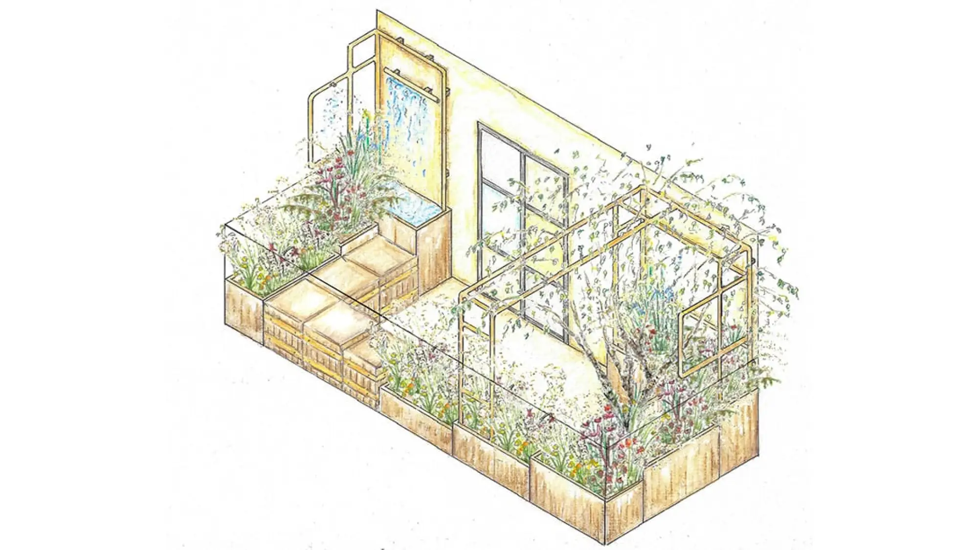 Grassland moves to woodland across the balcony, around a flexible space designed for sharing, mimicking elements from Fettercairn Distillery's home in the foot of the Cairngorms - often referred to as 'The Garden of Scotland'. A stunning 'vertical stream' cascades over copper and onto repurposed wood from a whisky cask, resting in a shallow pool beside the main seating area before being recirculated to restart its journey. Copper pipe wings wrap the garden, sustaining the planting via misters that use minimal water.