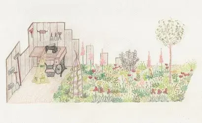 This border is inspired by my journey from sewing costumes for films to horticulture student as I look to change career into gardening. Like many people, I caught the gardening bug during 2020 where I discovered a love of growing flowers and veg. I loved the fact that I had gone from sewing costumes to sowing seeds and the journey that it has since opened up for me.
