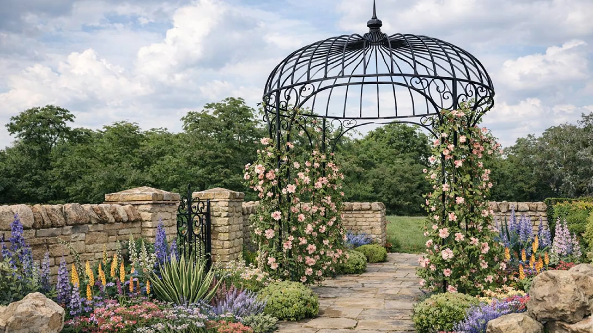 The character and heritage materials found across the picturesque Cotswold region lend the space a timeless feel. Beautifully constructed dry-stone walls, reclaimed stone and a central iron gazebo, forged by local blacksmith Matt Potts, highlight the importance of handmade features in historic garden design, while reinterpreting them through a contemporary lens.