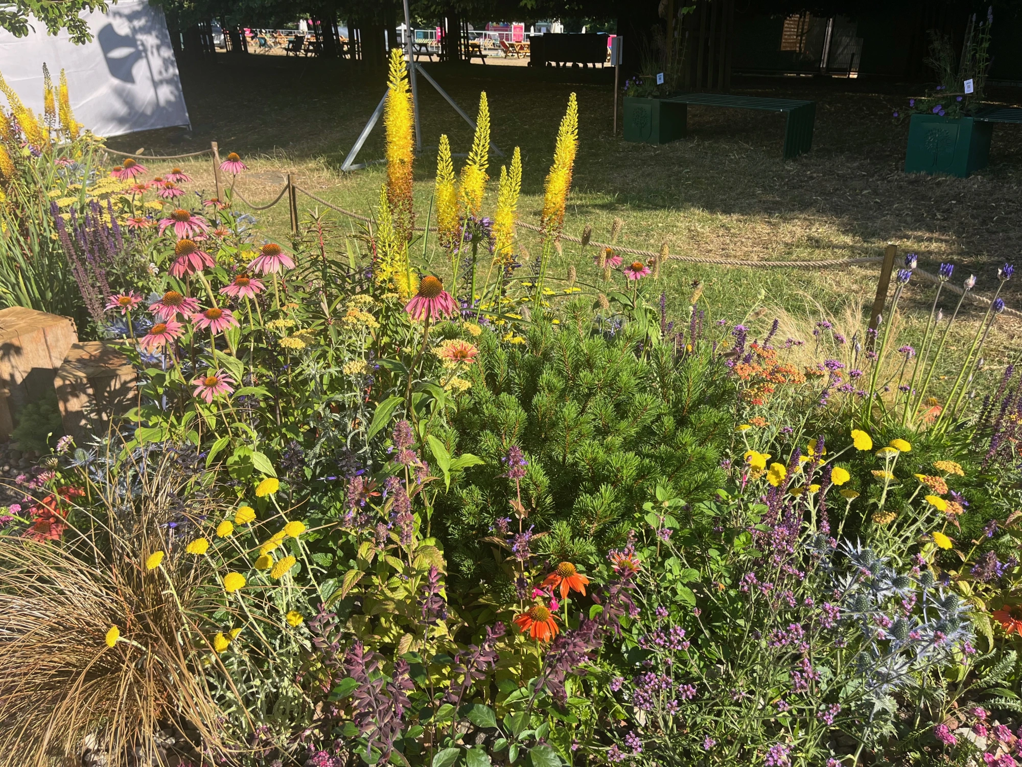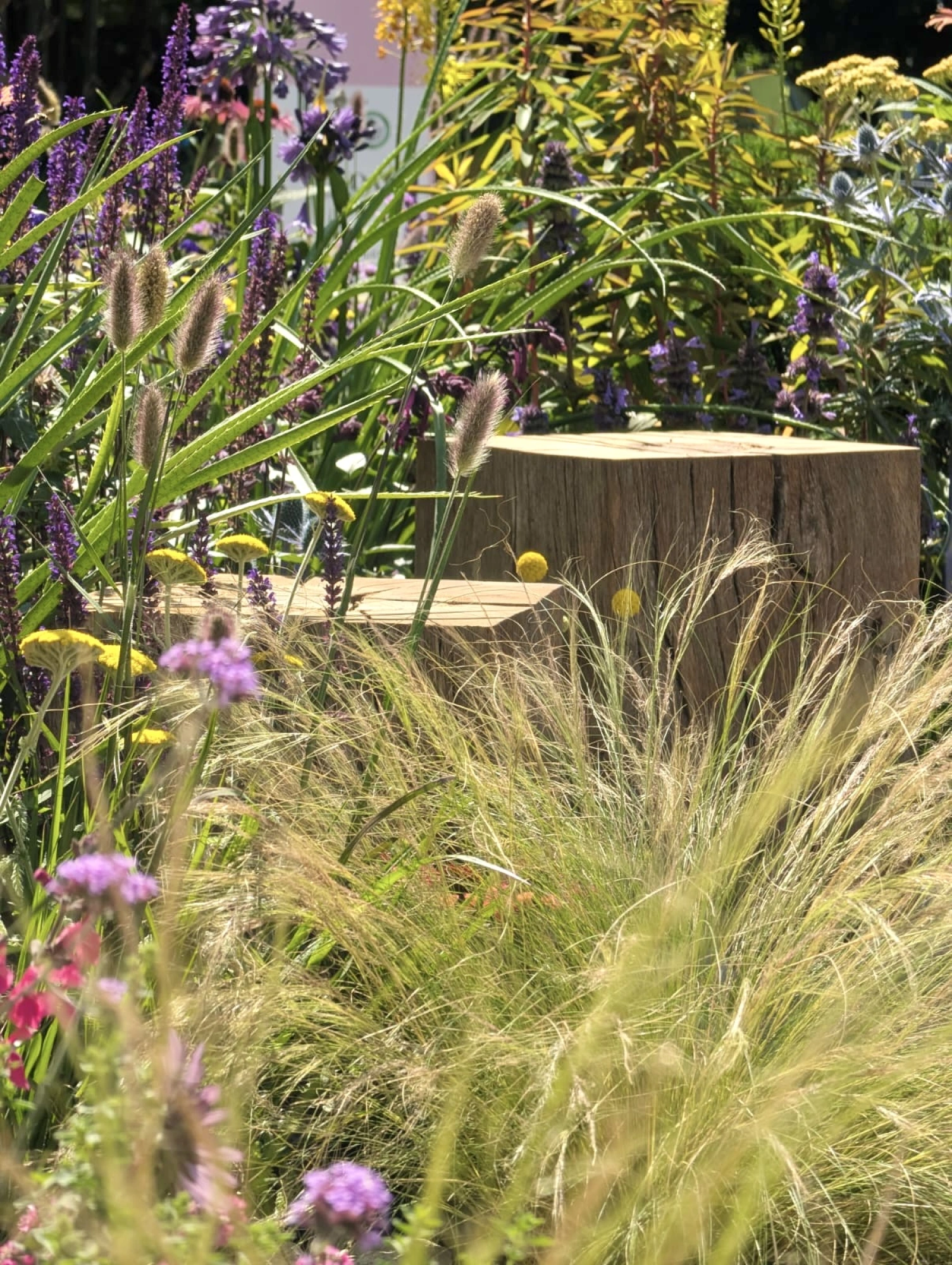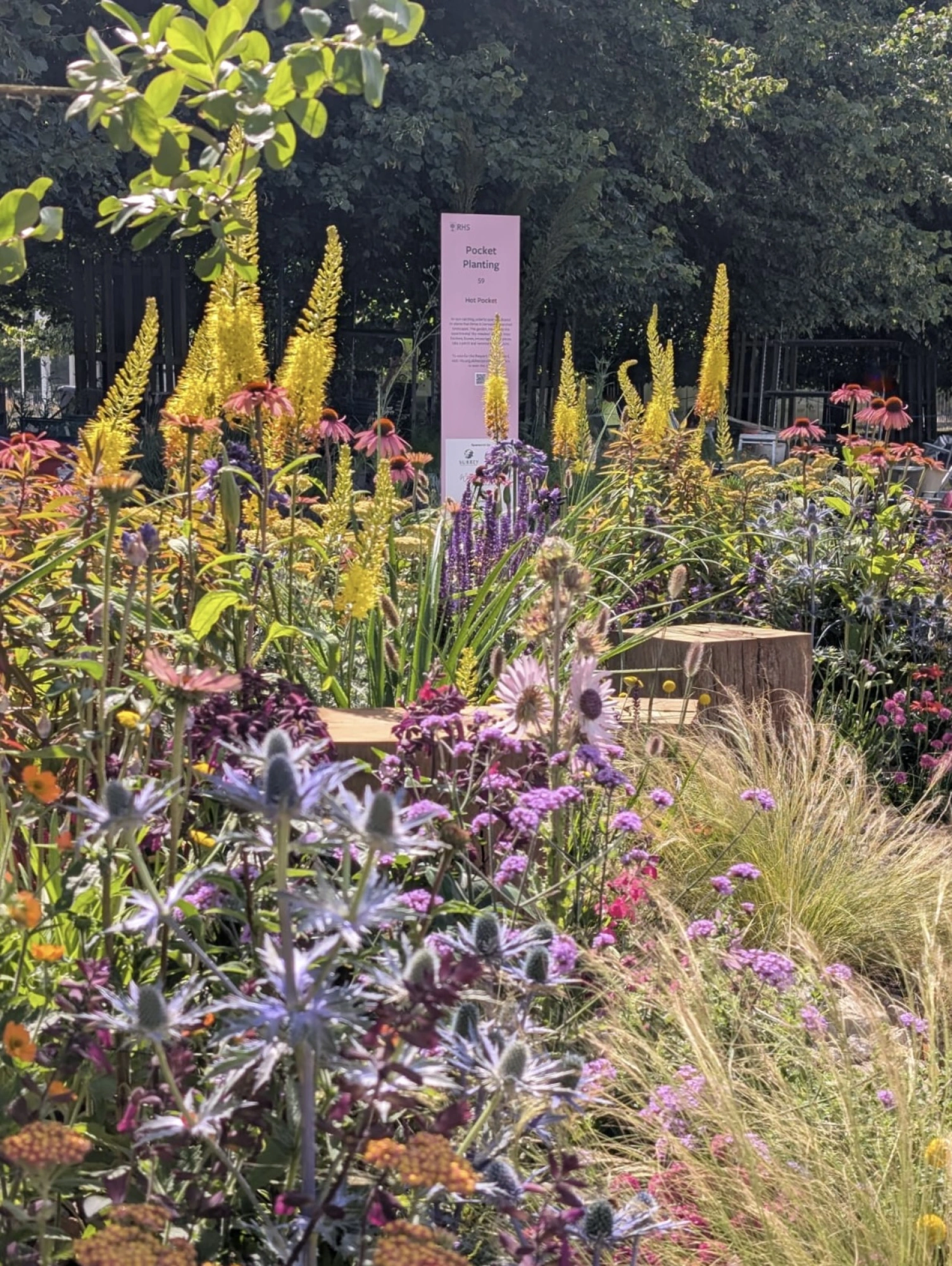 An eye-catching and colourful planting pocket, giving you time to pause, take a perch and reconnect with nature. The theme of the pocket focuses on drought tolerant plants that can thrive and survive in hot, dry and low fertile conditions and are good for pollinators. The pocket is inspired by dry meadow and gravel garden planting schemes that are resilient and can adapt to a warming climate.
