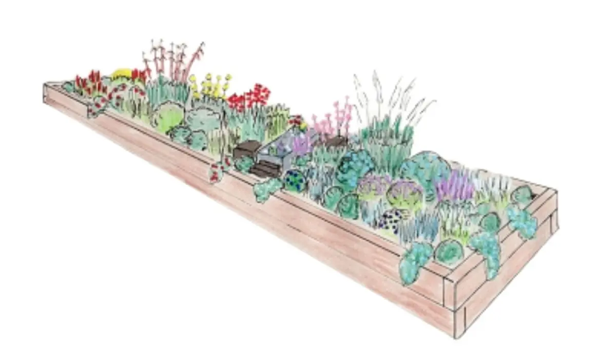 If he were alive today, I'm convinced that he would still love fuchsias, he'd modernise his planting and he'd wonder where the wildlife had gone. A design of two halves, one with cool colours and one with hot, separated by a cattle trough pond to attract frogs and thick with foliage to provide cover for hedgehogs. The height is given by two large grasses with a selection of bushy and trailing fuchsias accompanied by an array of grasses and seasonal flowering plants and, punctuated with hebe 'green globe' as a nod to the formality of traditional gardens that Harry loved to see in his own garden.