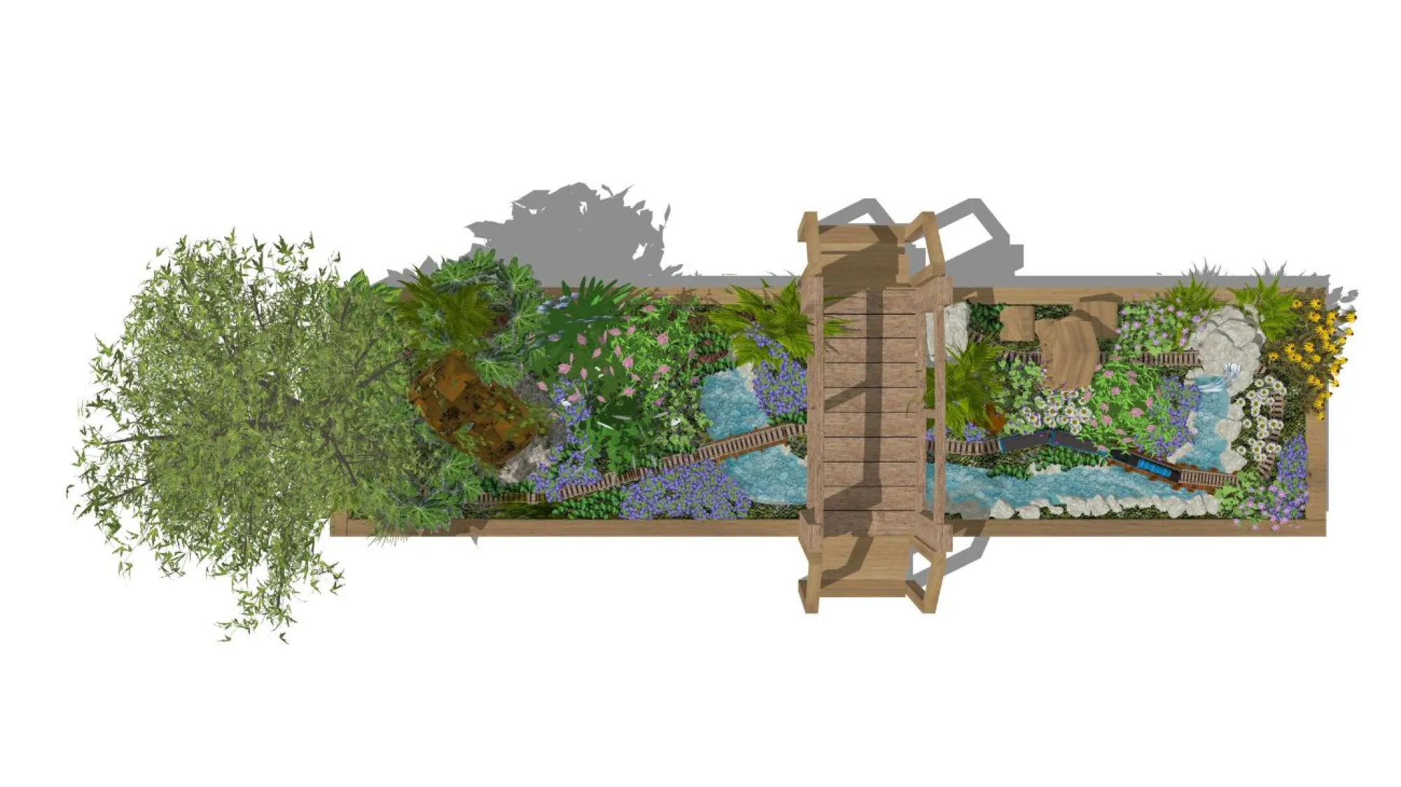 The one thing I think we all forget as we get older is that there is never truly a limit to our imagination and things can still be fun no matter what age you are. My garden captures a glimpse into the journey I take as a creative, a designer and most importantly - how I kept true to the believes young me had. It mixes the things I would have treasured as a child and how I can bring those forward to my adult life but how whilst the style, materials and appearance have changed, you can still see the true meaning of them (Like my bronze statue Little Tikes car - you wouldn't expect to see that in a show garden but actually⦠Why not?!) A working train drives through the garden, through the stone waterfall, under the building blocks, around the tikes statue and across the whimsical wooden bridges. Theres a detail in every corner and you just want to keep exploring. Just like the inner child in us all. The train isn't the only thing with a bridge. I will also be adding a bridge over the whole border. An homage to exploration by being able to actually cross the border, over the water and the fairy tale world beneath you. This is a garden for adults and children alike, planted up with hardy perennials to only maintain the longevity that is my goal to always keep the inner child alive in my life