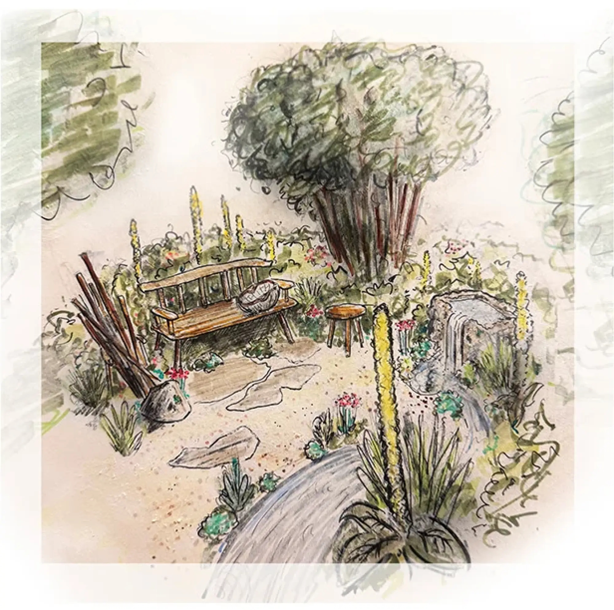 The garden is designed for traditional craftswoman Flo Hamer, one of the few basket weavers who practise this endangered craft and one of only three people who teach it.