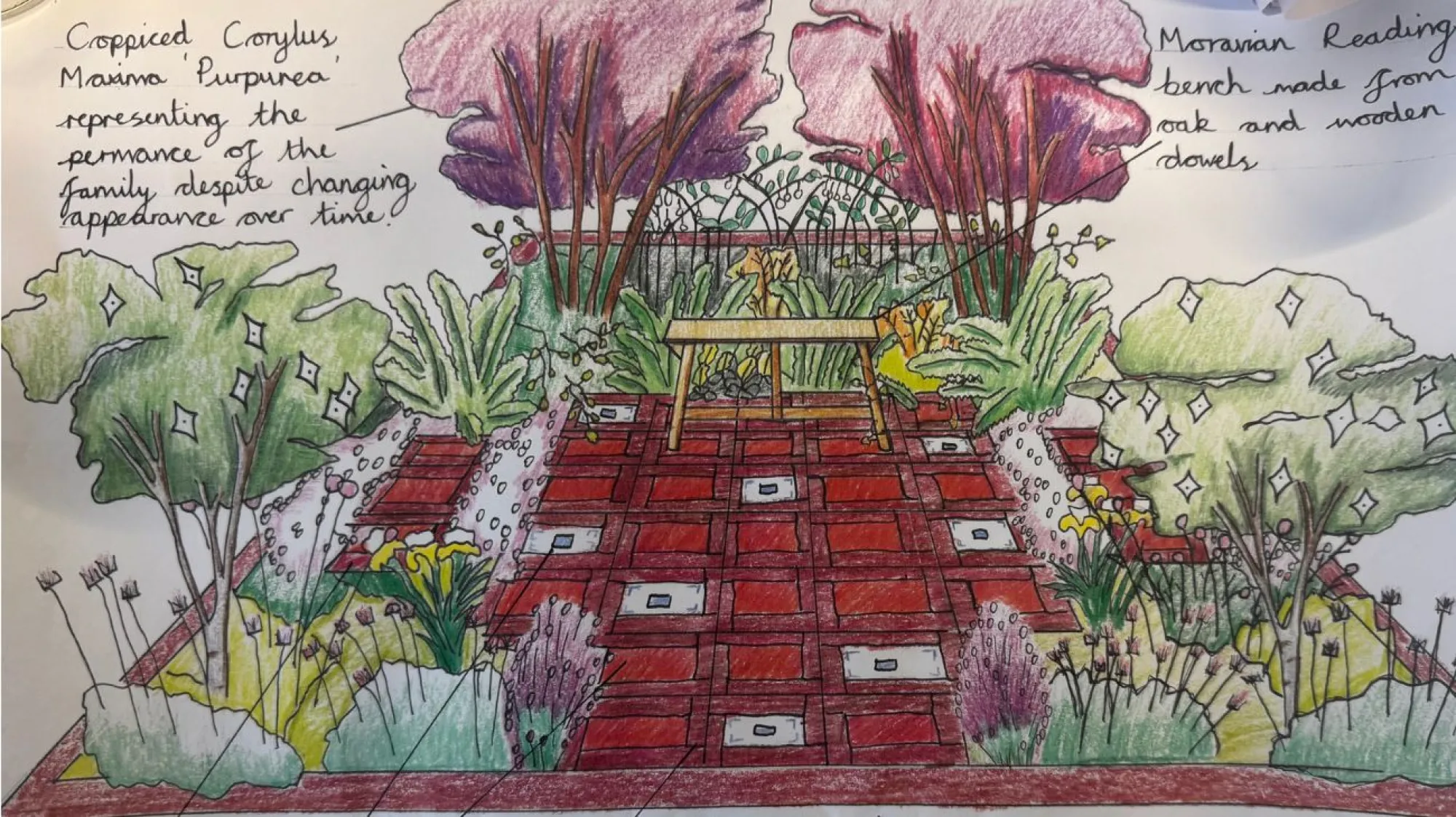 All elements of this border encourage story telling. The stepping stone entrances allow children and adults to come together from different parts of the garden and race off again following each child's own creative direction. To support this, uniform paving is interspersed with Delft style tiles depicting characters from stories children and adults will recognise. The bricks and quarry tiles carry the patina of the last century. They come from the same house in Nottingham and will be returned there after the show as a new garden feature. The bench at the centre of garden provides a focal point that tells a subtle tale of traditional craftsmanship and local, timeless materials. Planting is mainly herbaceous, telling the story of the changing seasons, with enduring trees to echo the changing appearance of a family overtime with the permanence of its essential structure.