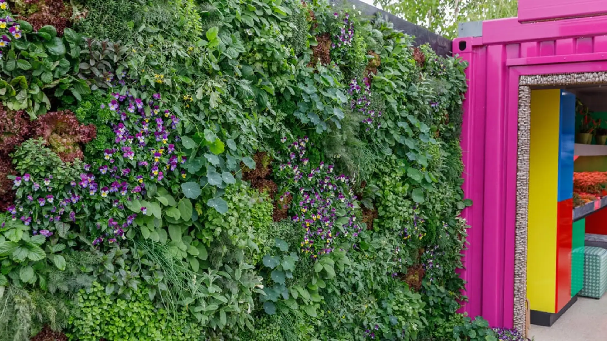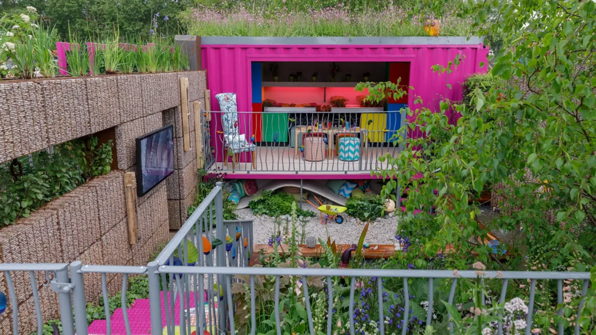 There are two greenhouses featured in the garden: one inspired by the Walipini designs - a sunken Victorian greenhouse - and another showcasing hydroponic technology, set among living walls, edible walls and an interactive wildlife pond area.