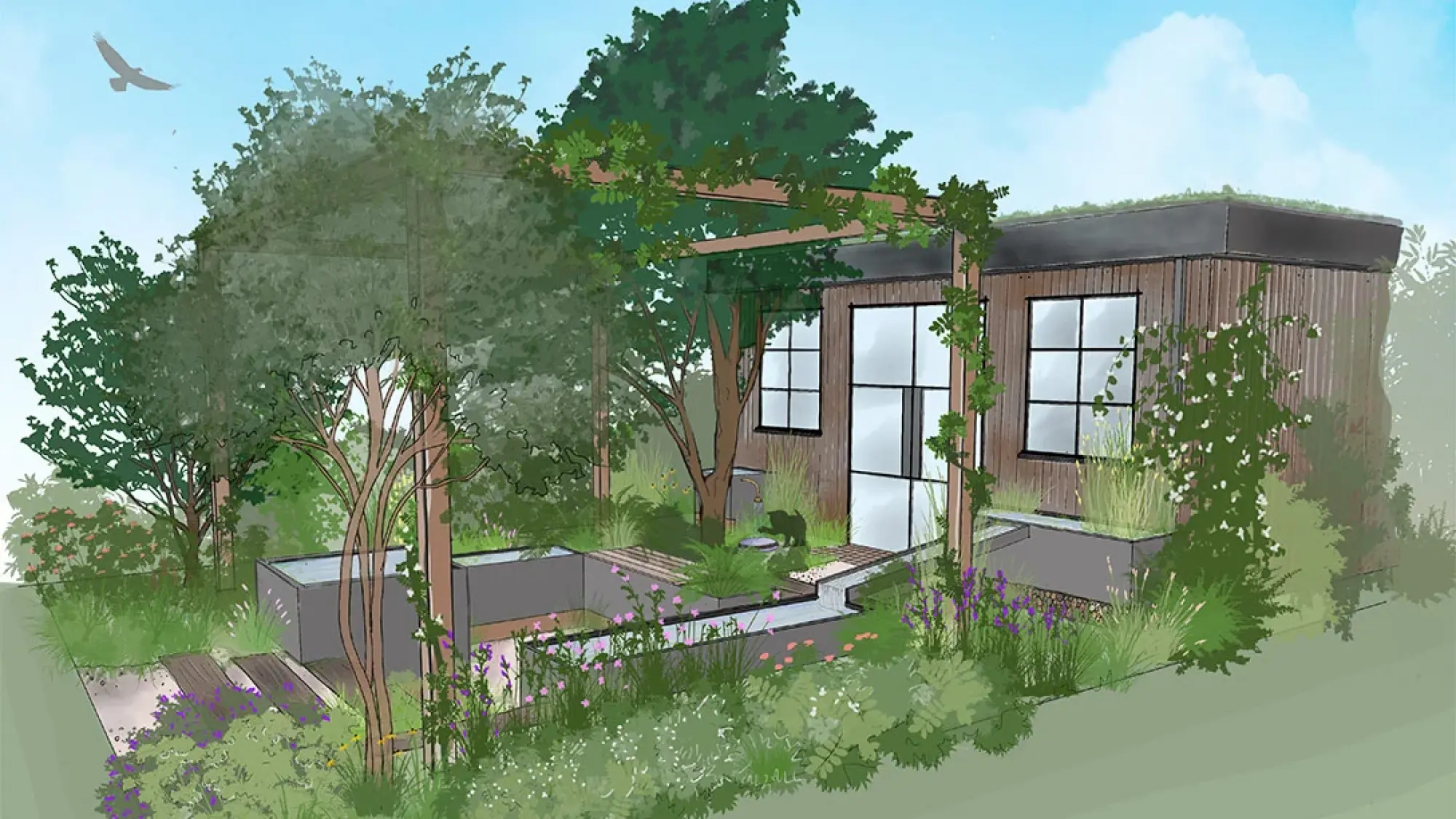 The Environment Agency warns that England could face a daily water shortfall of up to 5 billion litres by 2055. The garden explores how using our own rainwater can help mitigate this challenge, moving rainwater harvesting beyond pure function to become a beautiful, central design feature.