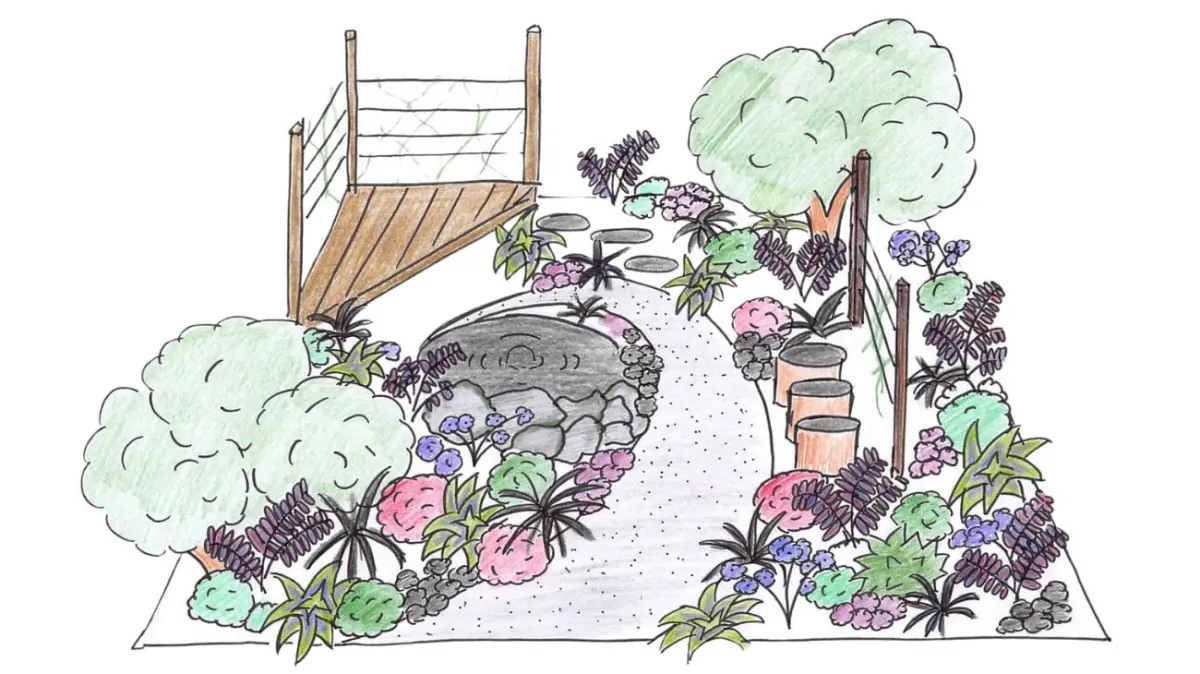 Once upon a time, I was a moody teenager with smudged eyeliner, a guitar in hand, and dreams of becoming a global rock star⦠not a gardener. If you'd told my 18-year-old self that I'd one day fall in love with plants, I'd have laughed and turned up the volume. This music inspired garden reimagines the kind of space I might have designed back then: dark, dramatic, and full of creative energy. Deeàpurples and moody foliage set the tone, while a winding bass-clef path celebrates my love of music. It's a place to unwind, write, or simply let inspiration grow. Proof that even the most unlikely passions can take root and flourish in time.