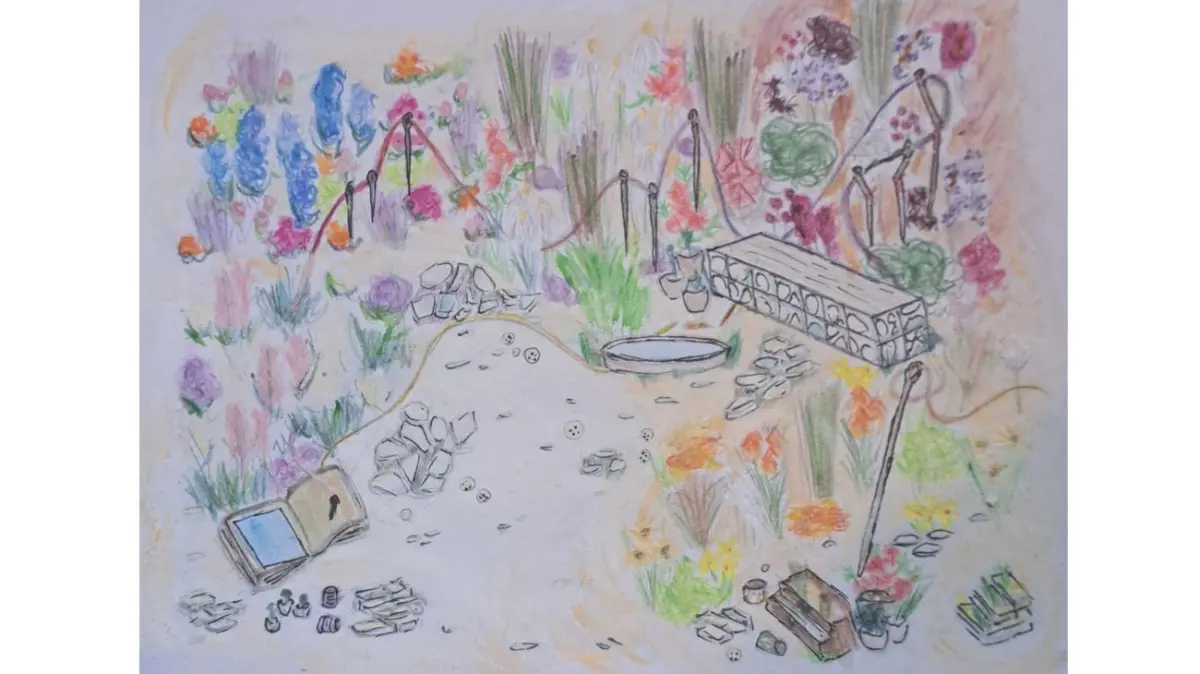 'Threads of Life celebrates five decades of lived experience, where planting, path and sculpture form chapters that are still being written. Inspired by a lifelong love of sewing and creativity, textiles provide both language and structure. Colour, texture and form are stitched through prairie drifts, needles, mirrors and fractured elements, echoing growth, loss, illness, repair, reflection, grief, survival and hope. The garden speaks of fragility, mending and resilience.