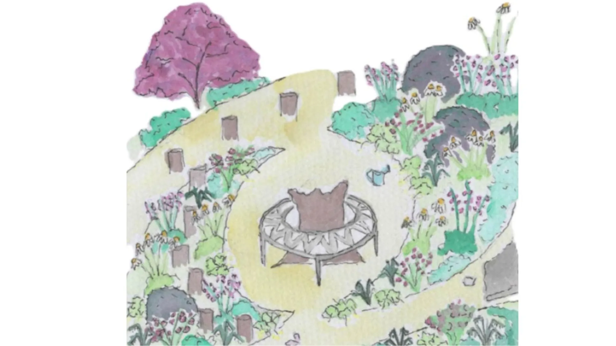 The design aims to show that you don't need a big budget to create something beautiful. With a little creativity, it's possible to build a garden that feels rich and welcoming, even on a shoestring. The design weaves together spaces for both child and adult, inviting playfulness, curiosity, and calm. There are stepping logs, through the border to give a child a sense of adventure. A mud pie making area, children's shoe kicked off in excitement and bug hunting pots scattered around. the central seating area immerses adults into the garden, creating a sense of calm and seclusion. A warm colour pallet has been used with simple inexpensive planting. The border shape has been created by maritime rope and the paths are simple self-binding gravel.